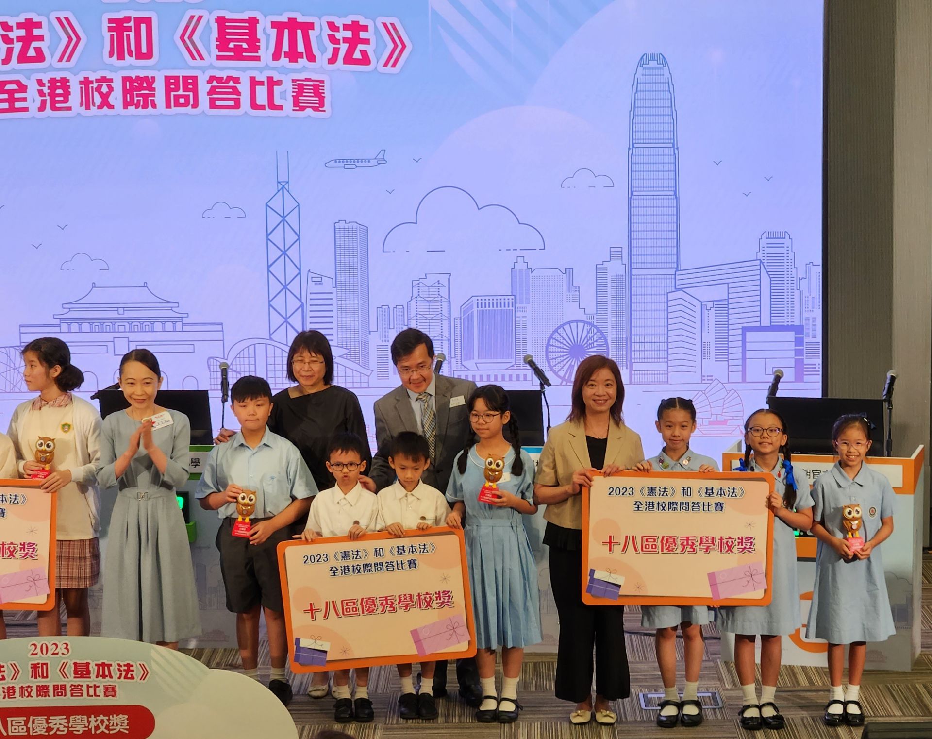 本校同學於教育局主辦之「2023《憲法》和《基本法》全港校際問答比賽(初賽)」中表現出色,獲得「十八區優秀學校獎」並晉身決賽。2023年7月21日(星期五),四甲班李昊鳴、 四丁班張苡喬、四丁班楊雅晴及六甲班李希鳴同學代表本校參加了決賽,表現亦出色,結果 獲得優異成績。本校獲得的獎項如下: